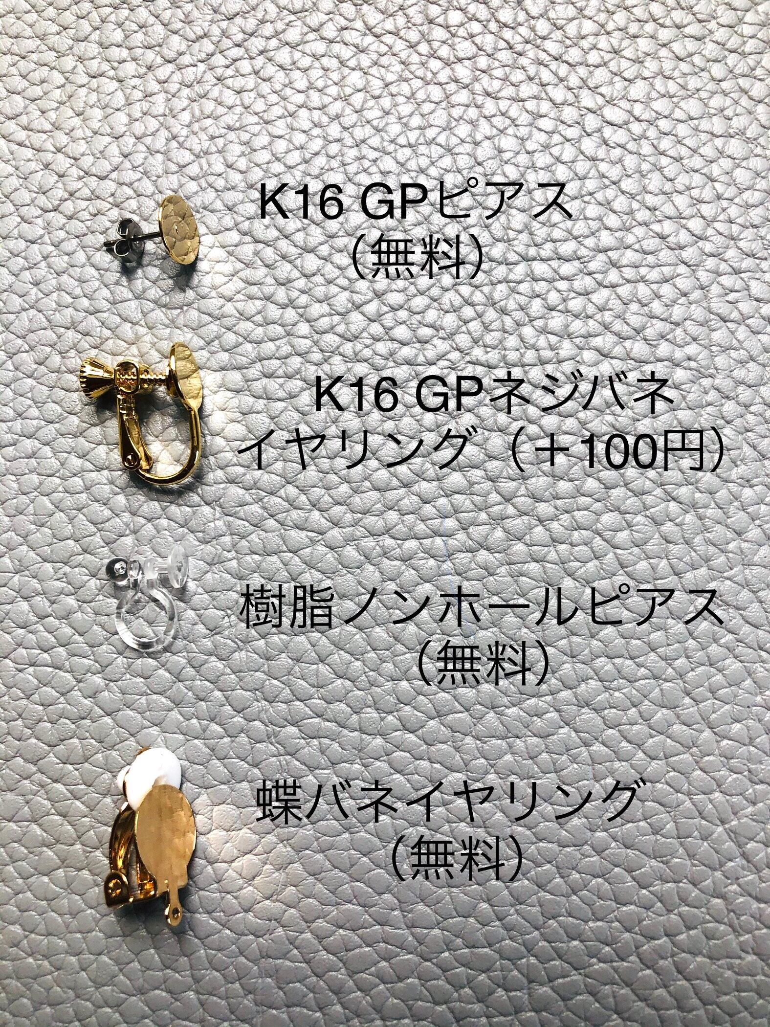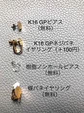 ピアス、ネジバネ式イヤリング、蝶バネ式イヤリング、樹脂ノンホールピアスの中からお選びください。