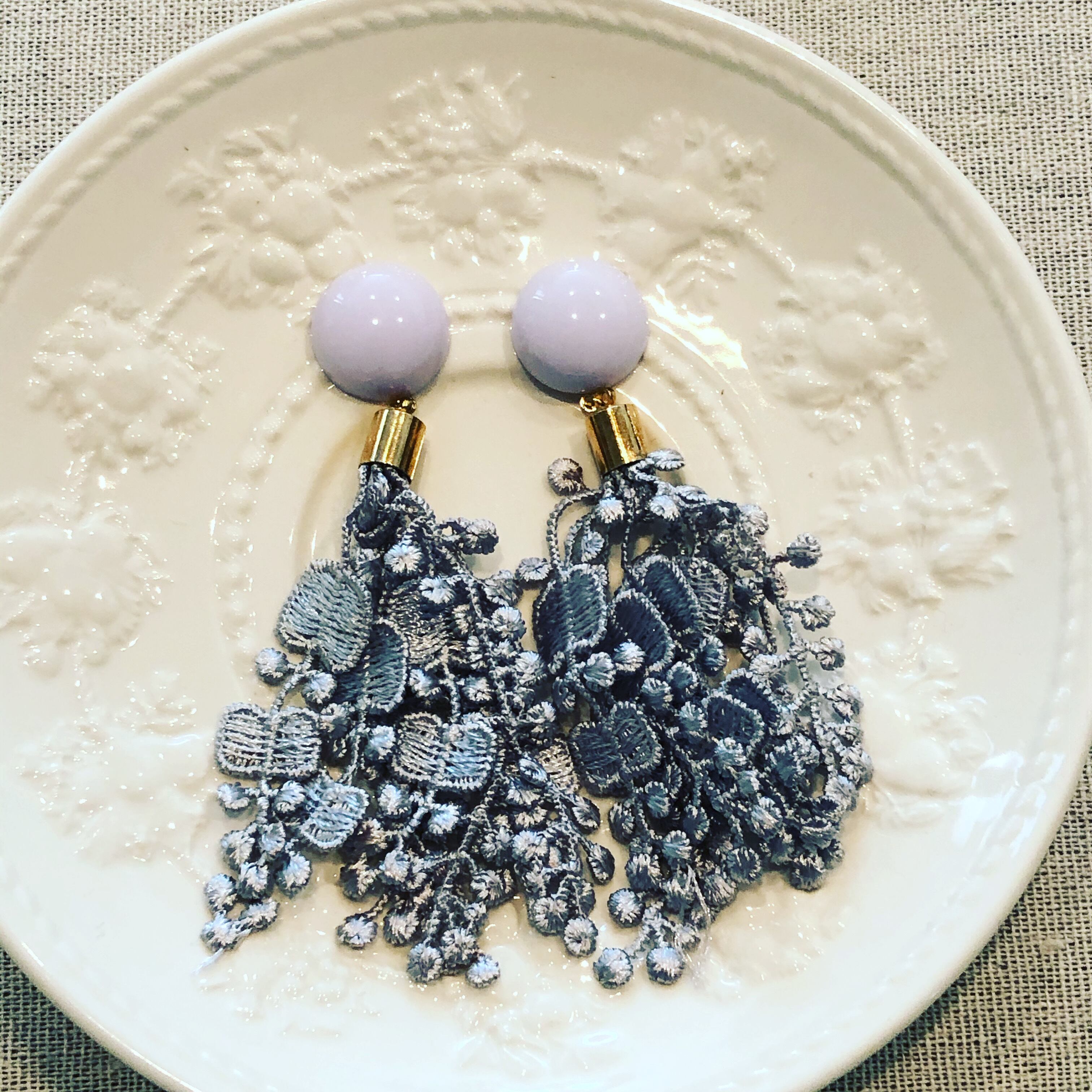 淡いパープルのカボションと淡いシルバーグレーのレースチャームの組み合わせです。