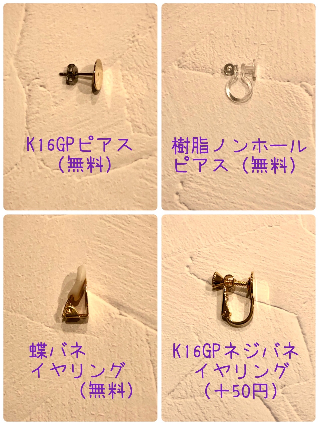 ピアス、樹脂ノンホール、蝶バネイヤリング、ネジバネイヤリングの中から、金具をお選びください。