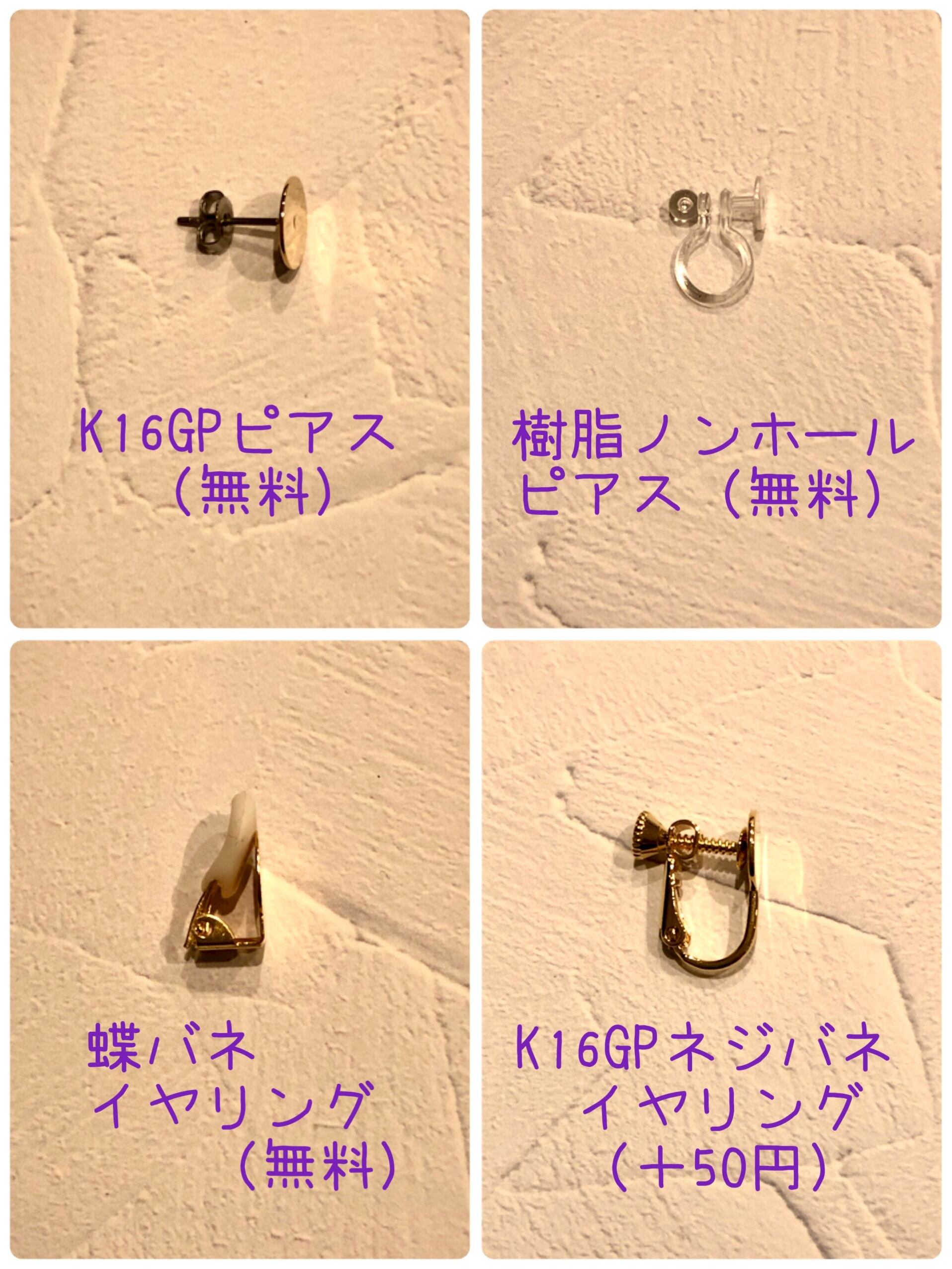 ピアス、樹脂ノンホールピアス、蝶バネイヤリング、ネジバネイヤリングの中から金具をお選びください。